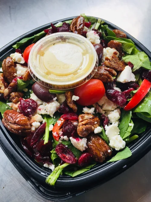 Fresh Spinach, Cherry Tomatoes, Kalamata Olives, Craisins, & Feta with Glazed Pecans and Fig Vinaigrette