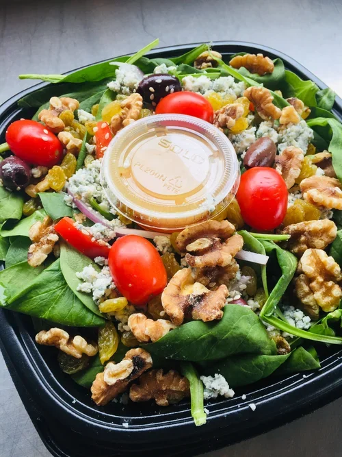 Fresh Spinach, Walnuts, Golden Raisins, Red Onion, Cherry Tomatoes, Blue Cheese, Pepper Jelly Vinaigrette